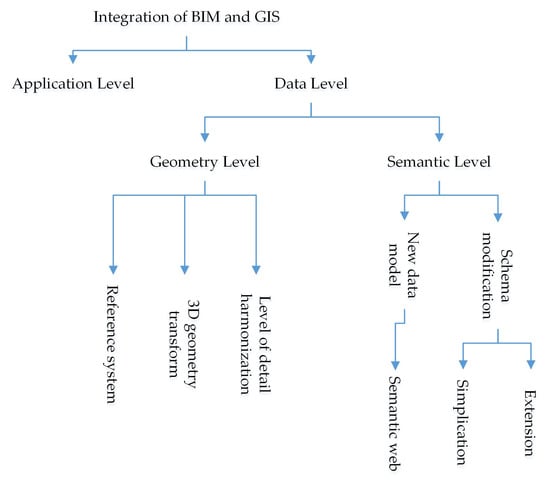 Since IFC and CityGML are often chosen as the representative data schema for BIM and GIS respectively [46,56], the following discussion regarding data interoperability will mainly be based on them, which means that the transformation of BIM to GIS will mainly refer to the transformation of IFC to CityGML.