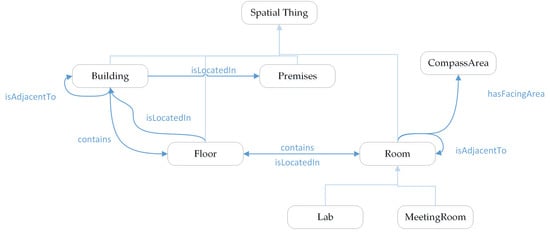 The last approach is to establish a new data model, or an intermediate data model, as the bridge for IFC and CityGML. With respect to creating a new data model, an example would be the Urban Flood Model, which is XML-based and designed to faciliate micro-level flood damage assessment [62]. In this case, geometry and semantics from IFC were extracted using DI and BIMServer, respectively, and then merged again using the unique identifier of each element, and finally imported into the designed data model. In the second scenario of creating an intermediate data model, all the information from one end will go through the intermediate data schema in order to reach the other end. This method usually relies on semantic web technology, which is a set of technologies used to represent, publicate, and browse structural data on the web [56]. The core of a semantic web is its ontology, a term that originates from philosophy but has got a new meaning in computer science. An ontology typically consists of a finite list of terms and the relationships between them, used to describe a domain of discourse [63]. A hierarchy structure is usually used to describe an ontology. Figure 5 presents the hierarchy structure of an ontology of indoor location. In this case, the “SpatialThing” has four subclasses, including building, premises, floor, and room, while “room” is divided into lab and metting room. It also shows the relationships between them, for example, building should be located in a premises, while floor should be in a building, and a building could be adjacent to another building.