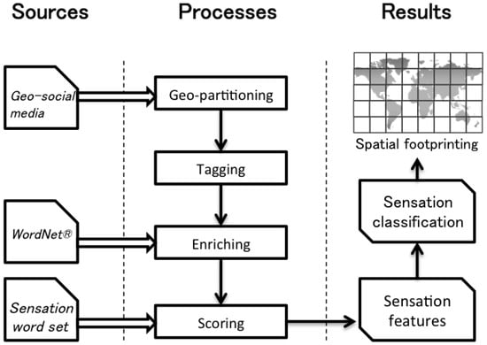 This section explains how sensation sentences representing social perceptual experiences are classified. First, a dictionary of representative seed words was built to include all five senses: sight (ophthalmoception), hearing (audioception), touch (tactioception), smell (olfacception), and taste (gustaoception). Next, the intensity of each sensation feature was calculated based on this dictionary and WordNet, and then, finally, sensation sentences were identified. Figure 2 shows the classification procedures of Geo-partitioning, Tagging, Enriching, and Scoring.