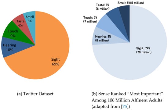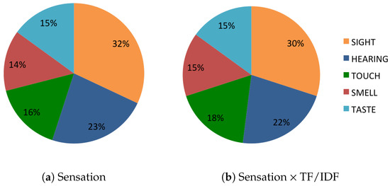 Comprehending individual preferences and public popularity results in successful marketing and product strategies. For this reason, opinion mining and sentiment analyses are the most active topics in social media big data as shown in [13,14,15,16]. Opinion is a primary influencer of human activities and decision-making. Subjectivity classifications indicating whether opinions are positive, negative, or neutral help companies identify how consumers perceive their products, services, and brands as well as indirectly obtain feedback from consumers. However, it was found that human sensory perception, called sensation information, is a primal factor affecting human behaviors preceding opinions, sentiments, emotions, and evaluations [17,18,19,20]. Sensation information has been applied to marketing to design new products and imprint company brands [21,22,23,24,25,26]. For example, human interaction devices such as Oculus lift (https://www.oculus.com/rift/) and Gloveone (https://www.neurodigital.es/gloveone/) fundamentally considered human sensory experiences in terms of their design and functionality. In [27], a language processor bridging the gap between perception and action was created to enable intelligent human–robot interactions during sensorimotor tasks. Although sensory experiences directly affect decision-making, actions, and sentiment formation in humans, few studies have considered sensation information itself in text mining.