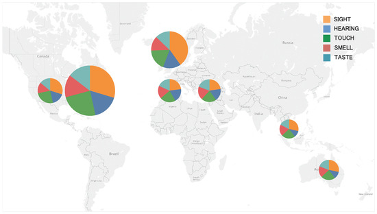 The geo-spatial sensation intensity distribution was investigated with approximately 80% accuracy across the glove using seven million tweets. Before geo-spatial analysis, it was verified that the proposed measure appropriately reflected real-world sensation intensities. Figure 3 includes two pie-charts showing tweet sensation intensities and the sense importance ratio of human behaviors from survey results [75]. From Figure 3b, sight has the greatest effect on human behavior (74%), followed by hearing (8%), touch (7%), taste (6%), and smell (5%). The sensation intensity ratio found using the proposed measurement, as shown in Figure 3a, is highly similar to Figure 3b. Thus, the proposed measurement can be considered a reasonable sensation intensity measurement within sensation classified tweets, as in the following examples: