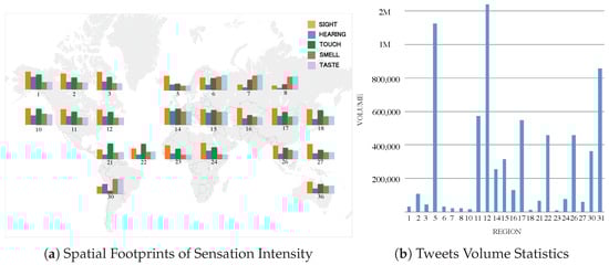 Additionally, it was verified that the weight functions (above) could appropriately normalize biased sensation intensities. Sensation intensity normalization was essential for identifying the importance of each intensity. In the Section 3, two weight functions were proposed to normalize the occurrences of words in sensation word sets and tweet texts. As shown in Figure 3a, the sensation intensity ratio is extremely biased toward sight sensations. However, sensation intensities, as shown in Figure 4a, demonstrated that overvalued sensation intensities were reduced more than the non-weight case in Figure 3a. In addition, the superpositions of sensation weights calculated with TF/IDF weights had approximately equal sensation intensities proportional to each other, as shown in Figure 4b. As a result, it was concluded that the weight functions were able to properly calibrate the sensation intensity biases. Thus, the geo-spatial analysis experiments utilized sensations with the TF/IDF weight function applied to clearly distinguish the ratio of sensation intensities.