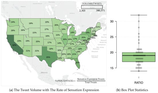 From Figure 7, the hypothesis proved to be reasonable, since the usage rate of the touch sensation intensity looked very similar to the average temperatures in most states. For example, California, Texas, and Florida showed higher temperatures than the northern states (e.g., Montana, North Dakota, or Minnesota) as shown in Figure 7a. Likewise, the usage rate of the touch sensation intensity strongly appeared in the same states (i.e., California, Texas and Florida) as shown in Figure 7b. From this result, we could consider that the sensation intensity has the potential to be used for the analysis of natural phenomena. Meanwhile, the usage statistics of Twitter could definitely influence this kind of experiments. This result could be written off as untrustworthy, if there was a critical imbalance in the usage statistics of Twitter or data volume, such as Figure 7b. To determine the reliability of our experiments, we surveyed the volume of tweet as well as the rate of sensation expression over all states during that time period. In Figure 8a, the green color indicated the tweet volume, and the displayed percentage values on the states showed the rate of sensation expression in the total volume of tweet. The average rate of sensation expression usage was 19.3%, and the standard deviation is 3.78 as denoted by the box plot graph in Figure 8b. The remarkable thing was that the sensation expression of all states remained the similar ratios, even if the total volumes were quite different between states. In addition, one interesting fact discovered is that the high temperature states (i.e., California, Texas, and Florida) represented high ratios of the sensation expression, such as 32%, 25%, and 30% respectively.