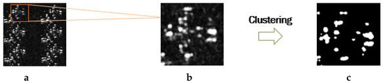 Sparsity in high-resolution SAR imagery. (a) Many aircraft targets; (b) One airplane extracted from Figure 1a; (c) The airplane is presented as scattering points after clustering.