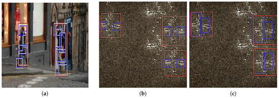 Figure 3a,b present the results for pedestrian and airplane detection with Felzenszwalb’s model, in which different resolutions are selected for different object categories, but not for the components in the target. As shown in Figure 3a, a detected person has five components, and each one is labelled with a 6 × 6 bounding box (blue) in the final detection. From the aircraft detection shown in Figure 3b, it is clear that the two components (the airplane head and the tail) are also detected with 6 × 6 bounding boxes (blue). Besides, when initialising the component model, the weight’s norm in different 6 × 6 regions of the root model are calculated, and the one with the maximum norm is taken as the component location. This means that the top-left corner of the region is regarded as the anchor point and the component is simply placed in the 6 × 6 region with high energy. In response to the problems above, the desired output of the ACSDM approach is shown in Figure 3c; the airplane head and tail are detected with appropriate size, matching the actual target more closely. Therefore, better strategies are needed to solve the following problems: (1) the size of the component is fixed, always be 6 × 6; (2) the anchor position of the component is determined by the region energy, not showing its real position.