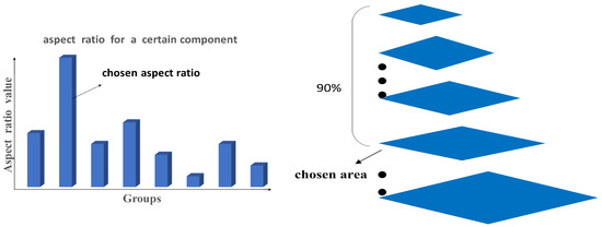 As shown in Figure 4, for a certain component, the ratio (height to width) in positive samples is classified into several groups. The aspect ratio is generally in the range of 0.5–2.5, and a group is divided at every 0.25 step. The aspect ratio value of y axis is the average ratio of the corresponding group. The ratio value of the highest histogram is determined as the that of the component. Meanwhile, through the coordinates information in the xml file, the bounding box area of each component is computed and reordered from small to large, and the area at the 90% position is decided as the standard value. In that case, the height H and width W are acquired through Equations (7) and (8). For different components, the same method is applied to calculate the corresponding H and W. The essence of selecting the aspect ratio through histogram is that one specific component in most samples has a similar aspect ratio. Simply computing the average value cannot deal with some special circumstances. If bad samples with quite different ratio appear in the training set, it will have a great impact on the average ratio. Indeed, the aspect ratio reflects its component class to a certain extent, and the statistical method can reduce the influence of bad samples. However, as the target has various depth in the image, the area of the same target can be different. In order to detect as many components as possible, the area of the components is set at the value of the 90% position.