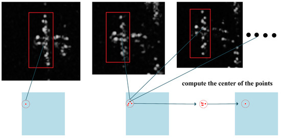 The detected results of the component are related to the size and the anchor point. In the ACSDM algorithm, the method to decide the anchor position is shown in Figure 5. For the head component in an aircraft, the relative coordinates of the component center to the red bounding box are calculated and normalized. With the central coordinates of the same component-class processed above, the anchor location is obtained by mean filtering [34]. For components in different types, the anchor point is acquired in the same way. In high-resolution SAR images, different attitude, incidence angle of the radar wave, or different terrain lead to various aircraft shapes, which means the component position is offset to different degrees. If all targets employ a fixed anchor point, the results are definitely unsatisfactory. Using mean filter to select the anchor point makes the located component more practical, but of course the accuracy will decrease.