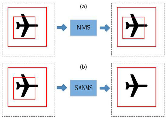 Among them, is the higher-score bounding area while is the lower-score bounding box, and indicates the overlap area between them. As shown in Figure 6, if is completely contained in and the area of is less than half of , the duplicate results will not be filtered out.
