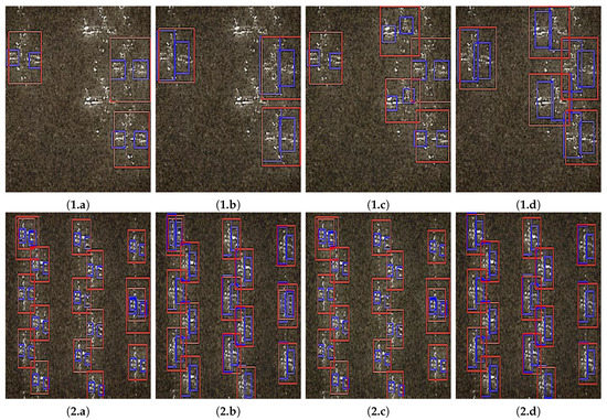 The comparative results are presented in Figure 8; it is clear that the three improved schemes do improve the detection performance. There are five aircrafts in testing region 1, but Figure 8(1.a) shows that the discriminative model could detect only three aircrafts, and the size of the two detected components in the image is a fixed value: 6 × 6, which does not match the size of the actual head or tail. Figure 8(1.b) shows the result of the discriminative model with adaptive component selected, in which the detected component size matches its actual size. In Figure 8(1.c), the discriminative model introduces the penalty factor into the score formula. With information loss in preprocessing compensated, the number of detected targets increased to five. Given that the redundant detection boxes do not appear, the results of the discriminative model with SANMS added are not presented. The detection results of the ACSDM method are displayed in Figure 8(1.d). Comparing with the detection in Figure 8(1.a), there are improvements both in the detection precision and the matching degree of component size.
