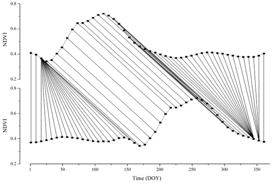 Warping path of two curves yielded by the open-boundary dynamic time warping method. The two curves’ growth seasons are staggered, but they are the same crop type. The open-boundary dynamic time warping (DTW) method is able to align these two curves’ growing season sections.