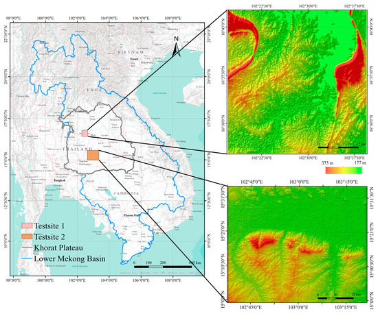 Two sites were selected to test our method. Both are near the Khorat Plateau in the Lower Mekong Basin (LMB), as shown in Figure 2. The location of the first site is 16°37′ N and 102°28′ E. The first site extends about 1914.1 km2 and includes a total of 175 × 175 MODIS pixels. The location of the second test site is 15°17′ N and 102°59′ E, extending 5606.3 km2 and contains a total of 276 × 325 MODIS pixels. The reason for selecting these areas for testing our method is because we had the validation classification maps of these two sites, provided by the Land Development Department at the Office of Soil Resources Survey and Research, for manual interpretation.