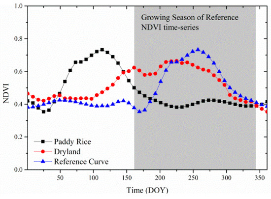 Three curves illustrating the effectiveness of the open-boundary locally weighted dynamic time warping (OLWDTW) method. The rice paddy curve is a man-made curve where the growing season section’s shape is identical to the reference curve. The dryland curve and reference curve are extracted from satellite time-series data.