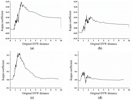 Relationship between the threshold values of the original DTW distance with the kappa coefficient. This step obtains the optimal threshold to extract crop types. The pattern is obtained by 300 randomly generated points: (a) is the rice paddy in test site 1; (b) is the dryland crop in test site 1; (c) is the rice paddy in test site 2; and (d) is the dryland crop in test site 2.
