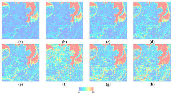 OLWDTW distance of single-cropped rice paddy cover in test site 1 with different enhance factor σ values: (a) σ = 1.5; (b) σ = 2; (c) σ = 2.5; (d) σ = 3; (e) σ = 3.5; (f) σ = 4; (g) σ = 4.5; (h) σ = 5.