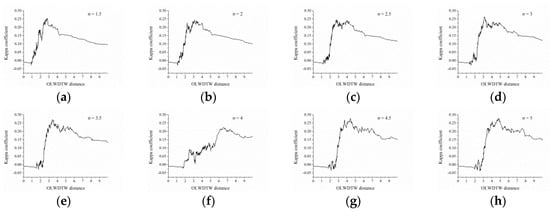 Kappa coefficient testing with different threshold values for OLWDTW distance with enhance factor σ: (a) σ = 1.5; (b) σ = 2; (c) σ = 2.5; (d) σ = 3; (e) σ = 3.5; (f) σ = 4; (g) σ = 4.5; (h) σ = 5.