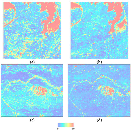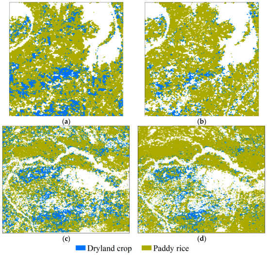 Cropland classification result using the original DTW distance and OLWDTW distance with the optimal enhance factor σ: (a) is the cropland distribution in test site 1 classified by original DTW distance; (b) is the cropland distribution in test site 1 classified by OLWDTW distance; (c) is the cropland distribution in test site 2 classified by original DTW distance; and (d) is the cropland distribution in test site 2 classified by OLWDTW distance.