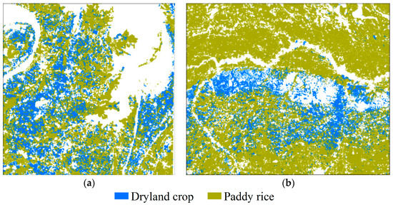 We used the paddy field class to verify the classification of our rice paddy class’ accuracy. The field crop class in the validation classification map was used to verify the dryland crop class’ classification accuracy. Note that the annual growth patterns of perennial crops are more similar to woodland rather than dryland crops, so the field crops were used for validation of the dryland crops. The distribution of the paddy field class and dryland crop class in the validation classification map is shown in Figure 10.