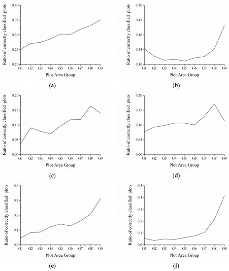 Relationship between the OLWDTW classification accuracy and the plot size: (a) is the mean number of correctly classified plots in each group in test site 1; (b) is the mean number of correctly classified plots in each group in test site 2; (c) is the mean number of correctly classified dryland crop plots in each group in test site 1; (d) is the mean number of correctly classified dryland crop plots in each group in test site 2; (e) is the mean number of correctly classified rice paddy plots in each group in test site 1; and (f) is the mean number of correctly classified rice paddy plots in each group in test site 2.