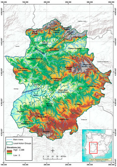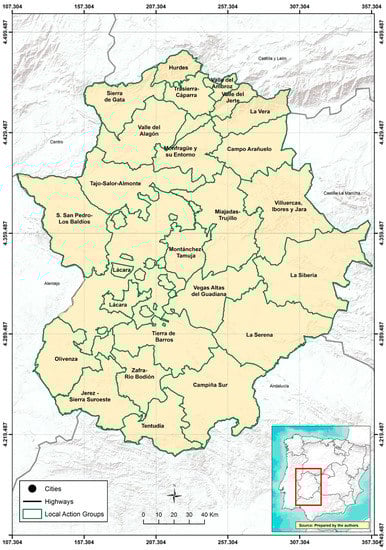 The rural territory is of great importance in the configuration of the Extremadura region, as it is one of the key elements in its social and economic structure. Furthermore, the rural area provides the physical support for a vast and varied natural and cultural heritage, which has served as a base of many economic activities that generate important levels of employment and income through the LEADER (Liaisons entre activités de Development de L’Economie Rural) Approach. Since 1991, the EU objective has been activating the potential of rural areas and stabilizing its population through diversification of economic activities with the introduction of new ones to complement the agricultural sector [2]. The other objects include preserving the rural heritage, maintaining an adequate demographic level or promoting the use of new technologies [3] and ensuring sustainable rural development [4], paying special attention to the agro-environmental aspect, which has also been widely studied by authors, such us Gabrielli et al. [5], Jaraite and Kazukauskas [6], Marconi et al. [7], and Ziolkowska [8].
