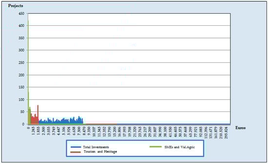 The typology of the projects is different. There are more projects (3163) in Tourism and Heritage, but with less investment; the average value is 58,894 Euros in Tourism and 30,661 in Heritage. In contrast, in SMEs and Valorization of Agricultural Production, there are fewer projects (2630), but with greater investment, with an average of 77,438 Euros in SMEs and 100,065 Euros in in the second one.