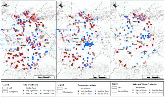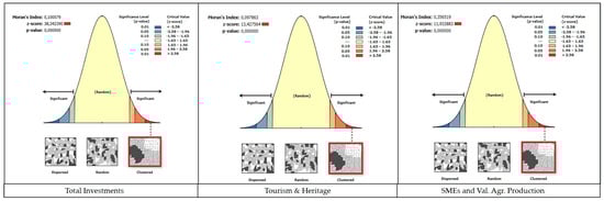 The Moran’s Global I clustering results were obtained in the three analyzed variables, with a higher concentration in total investments (z = 38.34, Moran’s I = 0.10), followed Tourism and Heritage (z = 13.42, Moran’s I = 0.09), and finally by SMEs and Valorization of Agricultural Production (z = 11.9; Moran’s I = 0.35). According to the results at the local level (Moran’s Local I), groups with high values in investments were surrounded by scattered points with small investment, because the three correlations are negative with an expected I that varies between 1 and −1. The three cases have p values of 0.0.