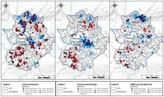 With regard to the results that were obtained with the Getis-Ord Gi* statistics (Figure 6) for the Total Investment variable, hotspots can be observed (units with high investments compared to the average surrounded by other ones with high investments compared to the average) in the population centers with the highest economic development and greater population. Therefore, there are 1375 hotspots (16% of the total projects) in the most urban and dynamic areas with the highest youth population. In contrast, there are concentrations of projects with a total investment below the regional average in the mountain and peneplain areas. Then, 3349 cold spots are located throughout the territory of Extremadura, but are concentrated in the same previous areas (mountain and peneplain) with physical constraints.