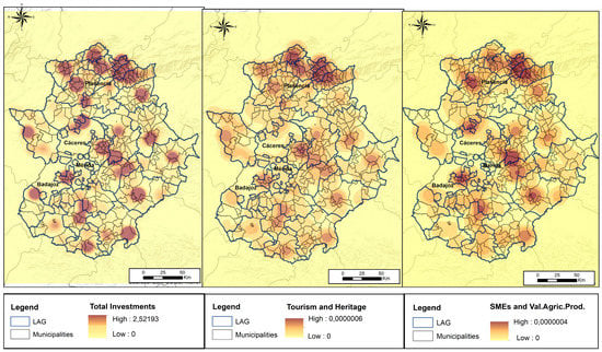 Secondly, three vector layers of points were created with the location of LEADER projects: one with information about total investment; a second one with the investment destined to tourism and heritage; and, a last one with the investment to SMEs (Small and Mediums Enterprises) and valorization of the agrarian production. Most of these projects are aimed at diversification towards non-agricultural activities through the creation and development of micro-enterprises. These enterprises will contribute to the expansion and modernization of these areas, encouraging a greater performance of the local economy, the promotion of tourist activities, and the creation of a product that complements the existing tourist infrastructure with the creation of information centers, museums, and so on. We analyzed these three sectors as that they are the ones with the most projects and investments.