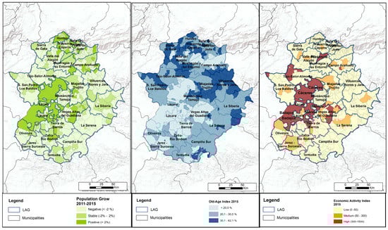 Economic and demographic indicators are featured below in Figure 8 to see whether the concentration of investments are achieving the expected results. In the demographic aspect, LAGs of the North of the region present an Old-Age Index, with average rates that are superior to 30%, in contrast with the most dynamic areas of the region, which have an average rates of 20%, as the cases of Vegas Altas del Guadiana, Tierra de Barros, and Campo Arañuelo (Figure 8). At the same time, these groups present the most alarming values in population loss, with negative growth rates in the period of 2011–2015 (only the towns with more urban characteristics and located mainly in Campo Arañuelo, Olivenza, Lácara, Tierra de Barros, and Vegas Altas del Guadiana increase their population).