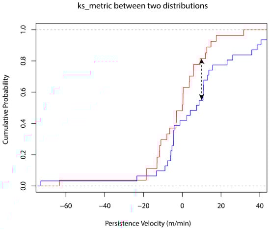 Given the observed persistence velocities Vp(t1), Vp(t2), …, Vp(tn) of a particular segment containing n samples, the empirical distribution function Fn(Vp) is defined as the fraction of the observations that have values that are less than or equal to the value Vp. Thus Fn(Vp) is the empirical cumulative distribution function, with respect to the n observations of the segment [52]. The ks metric is defined on the space of distribution functions, and the ks-distance between two empirical distribution functions [52,56,57] is obtained by calculating the supremum over the set of differences. Figure 1 indicates the ks-distance between two empirical persistence velocity distribution functions for two different segments.