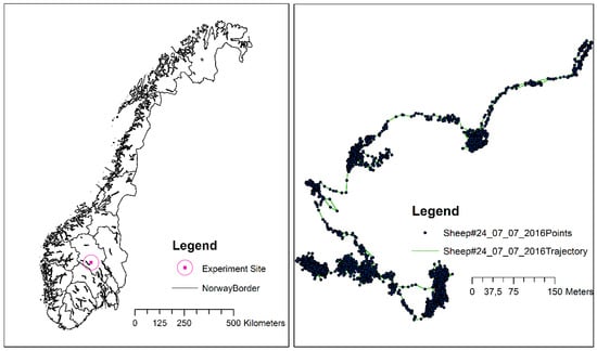 The dataset investigated in this paper belongs to an ongoing project, in which the main objective is to determine the influence of grazing on biodiversity. Four individual sheep were followed during the foraging season, in an established experimental site in Valdres in Oppland county, Norway (61.06° N, 9.40° E; Figure 2 (left)). The animals were tracked with a sampling frequency of 10 s, using Canmore GT-740FL GPS units (http://www.canmore.com.tw/pdf/GT-740FL%20DataSheet_V6.1.pdf). These units have a battery capacity of approximately 24 h when sampling data using this frequency. The GPS units were equipped with extra battery capacity, which extended the capacity to 3–4 days. The GPS position accuracy is specified as 2.5 m CEP (CEP, circular error probable, which is the radius of the smallest circle centered at the true position that covers 50% of the observations) under optimal conditions. The waterproof box with the GPS unit and batteries weighed approximately 400 g, and the size of the box was 13 cm × 10 cm × 5 cm.