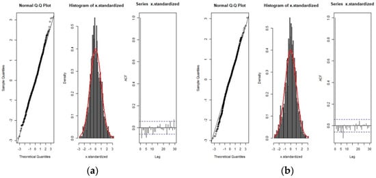 By doing the BCPA for various moving window sizes and inspecting their diagnostic plots, we concluded that 30 consecutive sampling points (equivalent to considering a time interval of 30 min) was a feasible moving window size for our dataset. Figure 3 illustrates the corresponding diagnostic plots, including the qq-norm plot, the histogram, and the auto-correlation function of the standardized example dataset for persistence velocity (panel a) and turning velocity (panel b). The result is consistent with the required assumption of normality. The residual plots show that the model has captured the dominant patterns of the data quite well, although there is a small amount of autocorrelation left in the residuals (indicated by some significant spikes in the autocorrelation function plotted in the rightmost parts of Figure 3a,b).