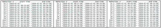A part of the typical text output of the algorithm (behavior 1 is resting, behavior 2 is foraging, and behavior 3 is walking).