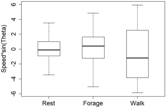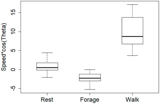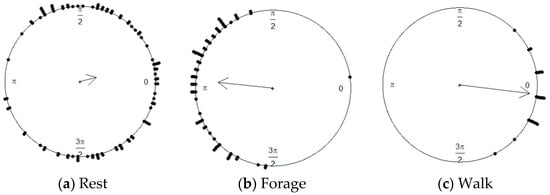 As already mentioned, the walking behavior of animals is expected to be characterized by high speed and small turning angles (high directional persistence) [3,7]. Low speed and low directional persistence, usually with mean of zero, is characteristic for resting behavior. Low-directional persistence while resting is commonly attributed to GNSS errors [49]. Foraging behavior is expected to be characterized by low to moderate speed values and low directional persistence, with many sharp changes in direction [7] (usually with a mean value different from zero). Turning angles and associated parameters and graphs are analyzed using circular statistics (the key concept and formulation of circular statistics is found in [50,51]).