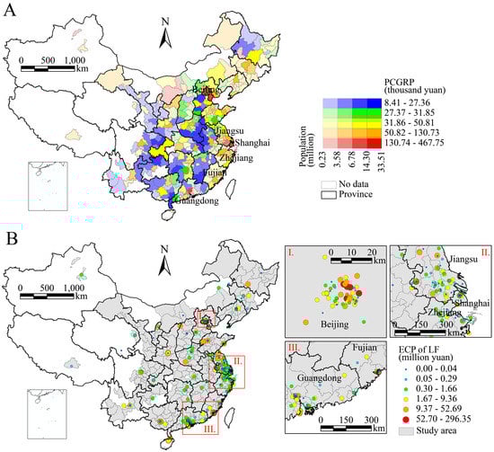 Local population needs for assistance with poverty, education and medical services are characterized from the perspective of socioeconomic development, education and medical levels, respectively, which means that a higher population need index indicates a lower current condition, and vice versa. Table 1 lists the proxy variables that are used to describe the local population needs or current conditions. Figure 1 also shows the basic socioeconomic information of population and per capita gross regional product (PCGRP) in the study area and the ECP of LFs. The three clustering regions of the LFs are I. Beijing, II. Jiangsu, Shanghai and Zhejiang, and III. Fujian and Guangdong.