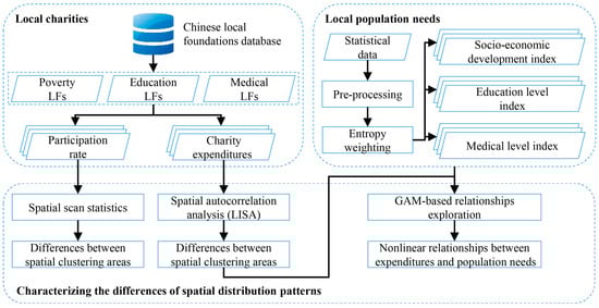 Both statistical and spatial statistical methods are utilized to characterize the distinct gaps between the distributions of three kinds of local charity foundations, namely, poverty, education and medical assistance, and city-level local population needs in China. Figure 2 shows the steps for data processing, including exploring local charities, detecting local population needs and characterizing the differences in the spatial distribution patterns. The methods used in these steps are introduced below.