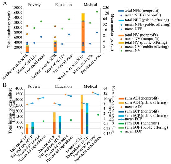 Figure 3 shows the statistical summary of the numbers of participants, including employees and volunteers, and annual incomes and expenditures for both nonprofit and public offering LFs. In general, 118 LFs for poverty assistance, with 79 nonprofit and 39 public offering LFs, are distributed among 53 cities; 221 LFs for education assistance, with 139 nonprofit and 82 public offering LFs, are among 67 cities; and 361 LFs for medical assistance, with 236 nonprofit and 125 public offering LFs, are among 87 cities in China. This means that the number of nonprofit LFs is two times larger than that of public offering LFs and that the LFs are merely distributed among less than 30% of the cities in China. Figure 3A shows that the total participant number of LFs for medical assistance is much larger than that for poverty and education. Additionally, the total participant numbers of nonprofit LFs for poverty, education and medical assistance are 4.92, 5.44 and 3.68 times larger than those of public offering LFs, respectively, and the numbers of volunteers are 6.43, 6.55 and 13.34 times larger than those of full-time employees for the three kinds of LFs, respectively. Figure 3B demonstrates that charity expenditure is higher than donation income for poverty assistance, but it is lower for education and medical assistance.