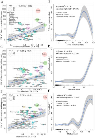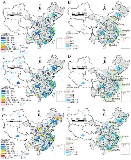 Figure 4 shows the geospatial distribution of the provincial total charity expenditures and their percentages of LFs in China. As the capital city of China, Beijing is the city with the highest number of LFs (NLF) and the highest total ECP and TAE among all cities. NLFs for poverty, education and medical assistance in Beijing account for 11.01%, 11.31% and 14.40% of all charitable foundations, respectively, but their ECPs reach 62.74%, 57.26% and 47.21%. ECPs in Beijing account for approximately 96% for all three kinds of LF, and other expenditures such as benefits and salaries for employees and administrative costs account for 4%. In addition, the expenditures in eastern and southern coastal areas and provincial capital cities are much higher than those in other cities. Cities with a total ECP for poverty assistance larger than 20 million yuan, for education assistance larger than 30 million yuan and for medical assistance larger than 50 million yuan are labeled on the maps. They are all coastal or provincial capital cities.