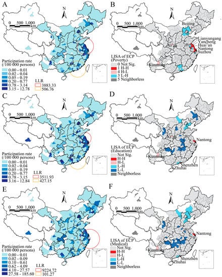 Spatial clusters of charity participation rate explored by spatial scan statistics (A,C,E) and the charity expenditures of local foundations detected by local indicator of spatial association (LISA) (B,D,F).