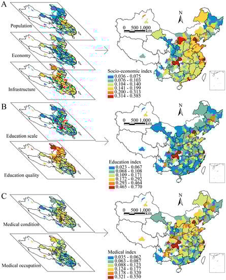 Distributions of entropy weighted socioeconomic development level index (A), education level index (B) and medical level index (C). The gradual changes from low values (blue) to high values (red) present the conditions get better.