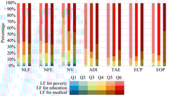 Figure 8 shows the summaries of local charitable foundation attributes, including NLF, NFE, NV, ADI, TAE, ECP and EOP, within the six quantiles of indexes of local population conditions, namely, socioeconomic development, education and medical level indexes. It is apparent that most of the local charity resources from human resources to donation incomes and charity expenditures are concentrated in the top two of the six quantiles.