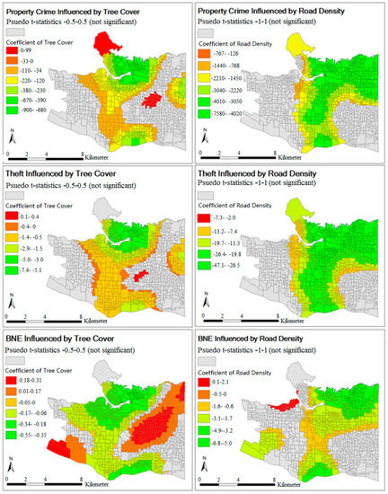 31], residential areas usually have more roads and greater road densities than commercial areas. As mentioned, previous research on road networks and crime found that complex road networks can reduce the number of property crimes. The methodology in our study found only the statistical relationship between road density and property crime. More study on road characteristics is required to determine their effects on crime. The findings are the inspiration for planning the urban design strategies to prevent property crime. The inverse correlation between tree coverage and property crime suggests it is possible that the Greenest City Action Plan carried out in Vancouver not only creates beautiful views and clean air, but also reduces the city property crime rate and provides a safe living environment for residents. In addition, the downtown core of the city is usually a place with a high crime rate. According to the GWR maps, because there is a stronger correlation between the tree coverage and property crime in downtown Vancouver, to reduce the property crime rate, tree planting projects should be carried out in the downtown core commercial areas. The inverse relationship between road density and property crime suggests that, to reduce property crime, urban planners should design complex road networks with more road segments and higher road density within the urban areas. In regions with lower tree coverage and lower road density, which are regions likely to have high property crime rates, more police resources should be assigned for crime prevention.