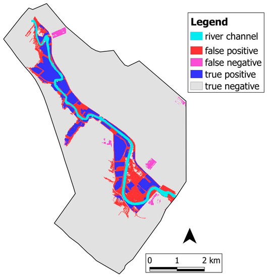 Example of contingency map obtained by pixel-to-pixel comparison of the hydraulic simulation using variable spatio-temporal Manning coefficients, as in [45], and the Synthetic Aperture Radar (SAR)-derived flood extent map at the same time step, i.e., 4:47 a.m. of 3 November 2010.