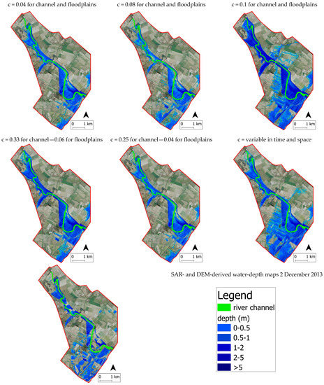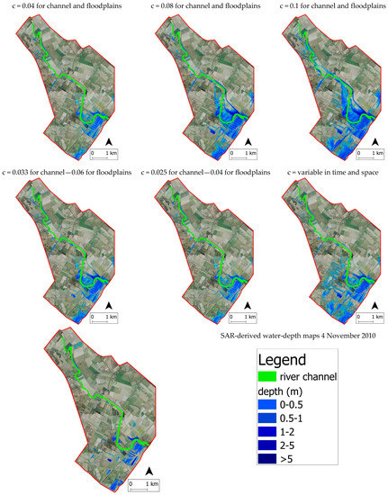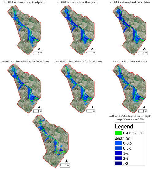 The value of the sum of each minimized sum of errors (MSE) for the various time steps (i.e., 3 and 4 November 2010) was lowest for the hydraulic simulation using variable Manning time-and-space coefficients c as compared to all of the other simulations. It was seen that variable Manning time-and-space coefficients c estimated observed data better than all the others, while all of the simulations put in place showed good performance in terms of flood extent maps during the 3–4 November 2010 flood event. Moreover, the results obtained highlighted the highest information content that could be found in those SAR flood maps that were acquired near the peak of the flood hydrograph and improved when more images were combined.