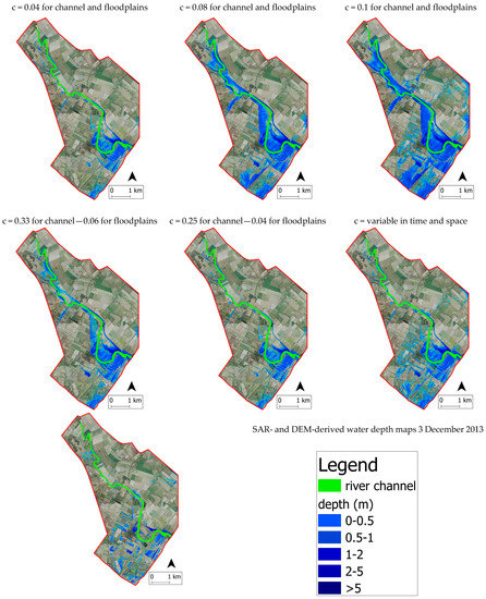 Lastly, the selected sets of Manning coefficient values were used in the hydraulic model to formulate predictions for the 2–3 December 2013 Bradano River flood event. The results of the validation process proved the robustness of the model under different operating conditions. In particular, using variable spatio-temporal Manning coefficient values, the model successfully simulated the dynamics of the two considered flood events, in terms of flood extent and water depth, thanks to the use of SAR-derived time-series flood maps for calibration and validation purposes.