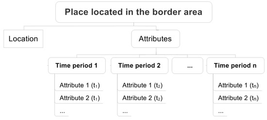 Taking the above into consideration, it was assumed that, in order to define each place that is located in the border area in the database, three components of the given place should be defined: location, time, and an array of attributes. As some of these attributes are changeable over time, it was established that each place should be represented in the database by simultaneous states of the object (object instance), i.e., its location with names in distinct periods of time. Within the given time period, the position and attributes of the place are to be defined. Due to the complexity of research at this stage, the focus was only on the variability of attributes (names), assuming the immutability of the location of a given locality (Figure 1).