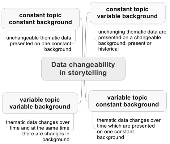 Today, that mode of understanding stories and storytelling has reached a kind of a limit. The intellectual, political, and empirical contexts within which stories were placed is starting to be replaced by practice, materiality, embodiment, affect, ontology, and knowledge discovery [,,]. This is the result of the process of digitization of huge data sets and the development of visualization methods, which created new opportunities for storytelling. So far, the most attention, time and money have been devoted to the process of obtaining data, creating databases, etc. Currently, the time has come to disseminate them, exchange them between institutions, as well as to use data collected in different resources, exploring knowledge hidden in them and their attractive presentation. These challenges create the needs for the modification, correction of achievements in the field of data acquisition, and development of new methodologies, dedicated to the wider use of collected data, and not just to owning them in a digital form.