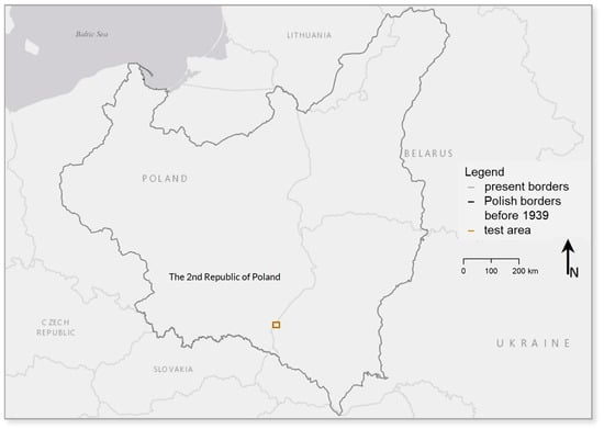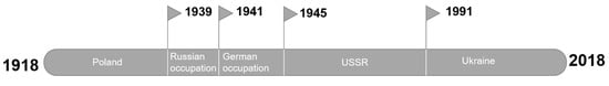 The research was supported by a case study focusing on studying the place names on the present Polish-Ukrainian border. Before the Second World War (until 1939), the analyzed area was the part of Republic of Poland with the official Polish language. After the Second World War, there have been major changes in the location of the political border and the analyzed region was divided into two parts. The first one, i.e., the western part, remained in Poland, while the eastern part became a part of the Soviet Union as the Ukrainian Socialist Soviet Republic (USSR) with the official Russian language. In 1991, on the eastern part, the independent Ukrainian state was established with the official Ukrainian language. Between 1939 and 1945, this area has passed from Russian to German hands several times, but these changes, due to their frequency and short duration (without new maps development), were not included in the studies. The timeline presenting the changes on the eastern part of the test area is shown in Figure 3. The location of the contemporary Polish border and of the border before World War II is shown in Figure 4.
