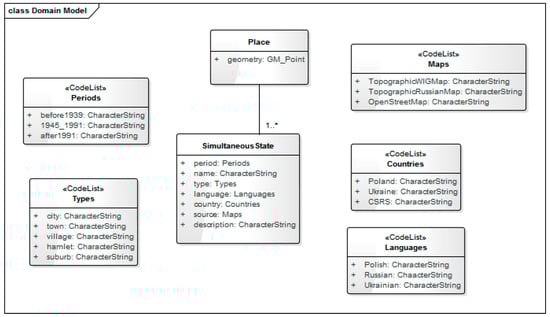 In the spatio-temporal database structure (Figure 6) it was assumed that each place (class: Place) consists of many different states of the object, depending on the time period (class: SimultaneousState). Each object state is described by a set of attributes, including: name (attribute: name) existing in a given period of time (attribute: period), as well as the language (attribute: language) and country (attribute: country) in which the name exists. The type of object is also provided (attribute: type) and the source of information about the given name is specified (attribute: source). Most of the attributes are defined in the form of code lists containing admissible attribute values (code lists: Periods, Types, Languages, Countries, Maps). The above structure allows for selecting the state of the object (object’s properties) in a given period of time, creating historical background map and presenting the story in the adequate historical context.