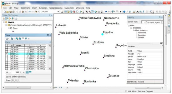 Taking into account the variability of place in time, as well as the possibility of presenting the collected cities with names depending on the user needs and expectations, a time-space database of localities was developed. This architecture of the database is presented in the form of a class diagram in UML language (Figure 6). Each simultaneous state is defined by the set of locality attributes that characterized them in the selected time period. The range of attributes, as well as the number of states can be extended depending on the user’s needs. Formal description of the database structure allows for implementing the structure in any database environment. Implementation of the database in ArcGIS is presented in Figure 7 and simultaneous states of the selected locality (instances) are shown in Figure 8. They present sets of attributes of the same locality in each analyzed time period (before 1939, 1945–1991, after 1991). The proposed database structure can be used to present thematic phenomena with the present or historical background, according to user needs and expectations. It has been assumed that storytelling demands both: background and thematic data. Background data, taken from the spatio-temporal database, may contain places with present, historical, or mixed names. Practical use of the database consists in selecting one (or several) simultaneous states of places in a given time period and presenting it as background data. The examples of different variants of the background generated from database are presented in Figure 8 and Figure 9. These variants of background can be used depending on what kind of thematic data is available. According to the rules presented in Figure 2, this may be thematic data that changes over time or not. If it is related only to one time period, then a background presenting names from only one time period (1937 or 1978 in the Figure 9) can be used. Such data can be also related to the present background (2017 in the Figure 9), especially if we need to relate past events into the present space. The other solution is to use historical names together with present names on the background map (2017/1937 or 2017/1978 in the Figure 9). If thematic data changes over time, it means that it is related to at least two different time periods. In such cases, the effective solution consists in using the combination of two (1978/1937 in Figure 9) or even three names (2017/1978/1939 in Figure 9) for each locality. Preparing maps with the use of proposed database provides unlimited possibilities of background design, which is the most important in border areas, where the names that are used are in different languages, depending on the time period. Placing thematic data into such background locates thematic data in the political context, which can be essential to understand the presented story.