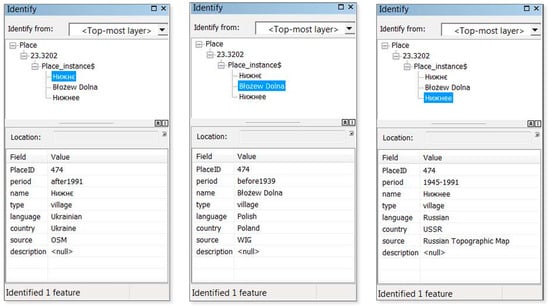 Bottom-up cross-border initiatives are the starting point for cooperation also in geographical, cultural, and historical research. Therefore, telling stories is not the only research motivation of the presented study. Spatio-temporal databases of places located in the border area can have several others possible application fields. One of them is to use spatial information (coordinates of place location) as an integrator of different kind of data as well as spatially-oriented cultural goods, which are referred to the common past of the neighboring countries, in a single common space. The information needed for interdisciplinary research is typically distributed over a vast range of domains, formats, and languages, reflecting the many different perspectives to be considered []. Integration of such data is the key point to obtain complete knowledge about the studied area, regardless of the political affiliation of each part of this area, and to conduct effective cross-domain research. In a situation where many researchers thought that at least 60% (some of them think that even 80%) of information is geospatially referenced [], spatial information seems to be a powerful integrator []. This is also particularly important in the case of movable heritage (e.g., archival documents), which is currently collected in thousands of cultural institution and databases scattered around the world. These monuments can be created in one place, but now they may be stored at an entirely different location, often outside the country of creation. Moreover, their content can be related to still other places, different from their place of origin or storage. This is due to the fact that movable monuments can be easily moved from one place to another, so their reference to geographical space is not unambiguous, as it can be changed over time. The descriptions of such monuments (in metadata), usually do not use coordinates. They are referred to places with which the monument is connected by the names of the town. However, these names can be changed, especially in border areas. This leads to situations when the description of the given archival document refers to a locality name used at the time when the document was created, the present name (in the language of the country where the place is currently located), or many other forms of names. Linking different forms of a name with geographic information can solve this problem, because information about location—as defined by geographic coordinates, not political membership—unambiguously defines a place in space.